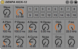 | Description: | Bass drum synthesizer Wave : Waveform (Sine-Triangle) Volume : Volume A Pitch : Attack Pitch R Pitch : Release Pitch P Decay : Pith Decay Time P Curve : Pith Decay Curve A Decay : AMP Decay Time A Curve : AMP Decay Curve N Decay : Noise Decay Time Noise : Noise Volume Click : Click Noise Volume Drive : Overdrive Freq : Cutoff Frequency Res : Resonance 1~16 : Memory Slots (Load:Click, Save:Shift+Click) |