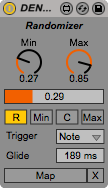 | Description: | This device randomize the selected parameter at the specified timing. Dial Min : Minimum Max : Maximum Tab R : Random Min : Minimum C : Center Max : Maximum Trigger : Note, 1/32, 1/16, 1/8, 1/4, 1/2, 1bar Glide : Glide Time |