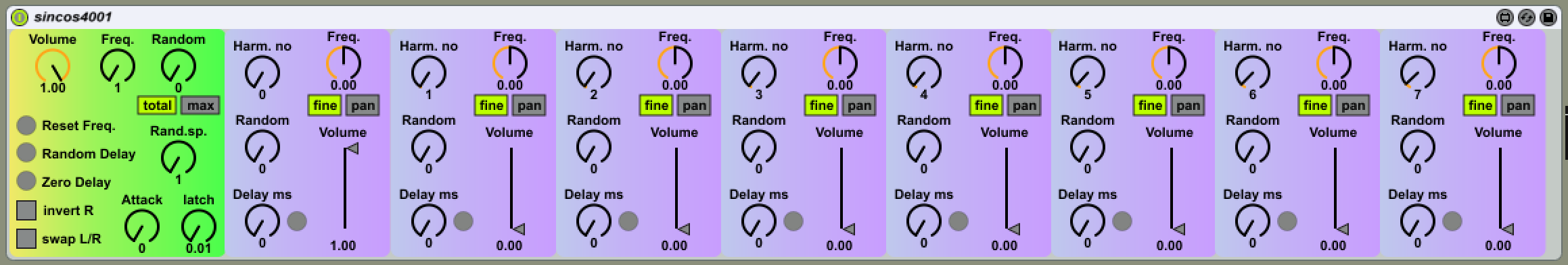 | Description: | Great for simple lissajous figures. Sine / cosine combinations for 8 harmonics with seperate frequency control (fine tuning) and volume randomizer, to make the image move. Recommended to use with a slow limiter. Redux also looks nice on it. Used in my live sets: https://www.youtube.com/watch?v=l8m5L2gqHPw&t=48s This was my first Max for Live patch. It's way too complicated but fun to play with. |