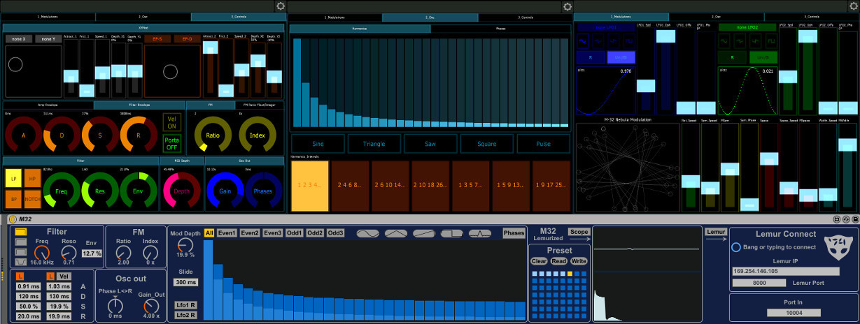 | Description: | Hi, An other little blue synth! :) M32 Is hybrid Additive synth which can be controlled by lemur. Hybrid because that can be FM synth also. The 32 harmonics magnitude is modulated by 32 points of "breakpoint" in Lemur. Is an sort of LFO*32. All others parameters can be controlled in Lemur. All Modulations come from Lemur. Without lemur the magnitudes is down so no sound. There are 2 LFOs, wich can be targeted to any of synth parameters. And 2 Multiballs XY also can be targeted to all parameters of synth. You can shape Harmonic as you want, and in supplement there are some buttons to get basic waves. this work if the mode of harmonic is set on "all" otherwise if you set in mode even or odd you obtain strange wave form. All data from Lemur pass by "OSC 4" You need put the IP of your PC and port in OSC 4. In M32 you need put the adress (ip) of Lemur and port. The adress by default is my ip change it. The port is 10004 you can change as you want. (change in lemur also) There are an preset box that can be controlled by cc3. When you recall an preset all parameters is updated in lemur. Save presets before close your set! (And write on HDD) For the rest move the knob and open your ears :) The files for Lemur is here: https://drive.google.com/open?id=0B_hfRZ740YbmZ3JuelByaTVJZFE And here and little set with some not very musical examples. But is simply for try connection quickly, and see how it work. LiveSet: https://drive.google.com/open?id=0B_hfRZ740YbmZFZGTEZMYjFLZEE sometime for me the connection can take severals minutes. be patient :) Basically i build it for make drone or other fx sounds. But i test it on bass sound and other lead, and is so good also for them. |