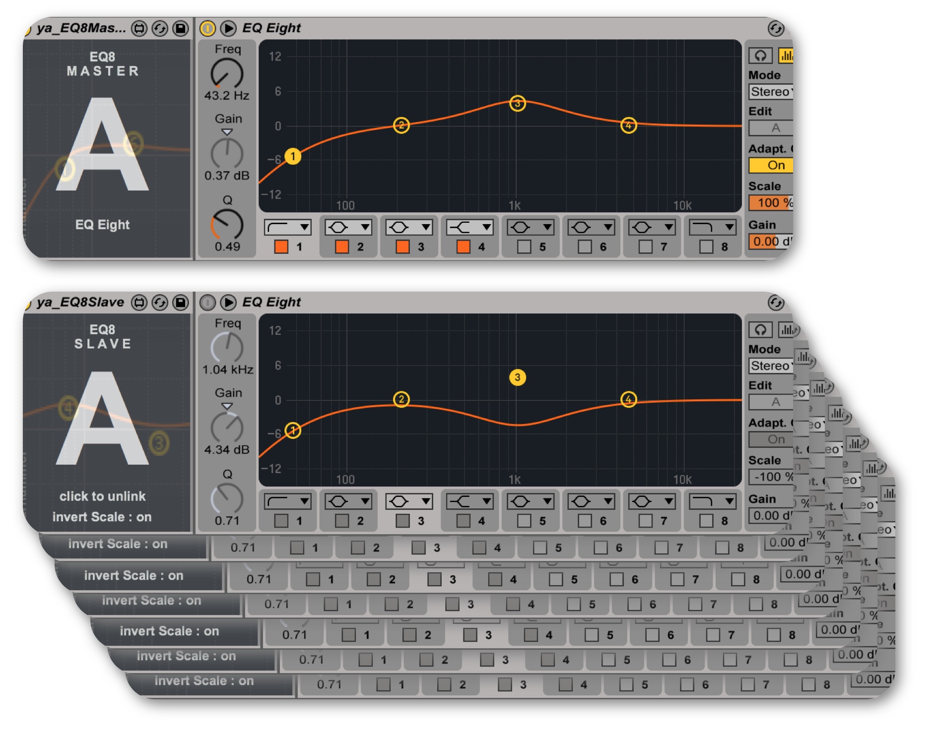 | Description: | link multiple EQ Eight across tracks, returns and racks. • 10 groups (A-J) are supported per live set. • place ya_EQ8Master just before any Live EQ Eight device you want to make a master • place ya_EQ8Slave just before any EQ Eight device on any other track, send or rack to make it a slave. • any changes to the master is also affecting all slaves of the same group • likewise any automation of the master device also affects the slaves • „invert Scale“ allows to invert the scale parameter value for each slave selectively this a specialized version of ya_Group for the EQ Eight device that optionally allows to invert the scale value. v.3.5 fixes and optimisation especially for Live 10.1 Please note: These devices have been created for our own use and only been tested on Mac. If you run into problems you may send reports and comments to contact@yarhammer.com |