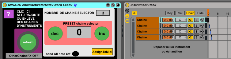 | Description: | Based on: ChaineActivatorMidi by morganjenks http://www.maxforlive.com/library/device/3895/chainactivatormidi audio version here https://www.maxforlive.com/library/device/4572 ------------------------ ATTENTION READ THIS FIRST ""RAck at the rigth of this patch is auto mapped to Chain Selector and no need assigned anything "" ""each chain selector need diagonaly assigned=0-127"" ""Clic REFRESH auto Num Number of Chain in the Rack"" -------------------------------------------- this patch is use to make rack instruments or FX to work as pseudo Program change .. with 128 preset who eatch chaine selector is one preset .. 2 assignable up down Button preset chain selector ( preset up down .. loop end auto return to first) 1 assignable chain selector NumBox to rotary CC chain can recall with a same number at the rigth off the CLIP Name ((bass funky 18 = recall chain 18) up down directely recall adjacent preset just recalled ((17-19)) Save CPU Button =Other Chain FX OFF auto desactivate all other plug or instruments in another Chain. ---------------------------------------------------------------------------- so eatch Rigth Number in the Named on eatch Clip on eatch Track on the scène recall All there specifics Preset Like a Groove box .. Live Scène= Pattern Number in the Clip name = Preset of that Track each clip has its preset .. cool and fun for Live with 8 Track ... Because eatch track can have 0-127= 128 vst instruments at presets if you want CPU friendly with Button= OtherFx OFF =AUTO desactivate All Plug to another Chain -------------------------------------- iam use it to recall instrument/vST chain preset add assignable midi -- inc / dec -- with loop the last chain to the first chain number of chain auto detect when clic refresh ( chain number = 0 to 127 ) Number at the end of clip name recall this chain exp1: midi clip name : Bass fret cool 14 Button inc / dec direct recall good next / preview chain = so 13 or 15 exp2: 33 Bass Lead 23 = call chain 23 (( Number must be at Right !!! Because ?? Ableton auto Name new Clip Recorded and set number at LEFT and need avoid new rec midi clip to interact with the chain )) cool ------------------------------- button " OtherChainFX-OFF " desactivate all plug to all other chain you can select " OtherChainFX-ON" if you pc have good proc and ram and you need extrem reactivity at extra low latency without draoput and click when need to change quickly preset , Even while continu to playing ------------------------------------- Add ,, Send ALL Note OFF and Pedal Sustain OFF at change ((prevent note blocked)) --------------------------------------------------------------------- To avoid reconfiguring your midi controller button Button assign to midi note or midi CC ((no noteoff)) if assigned ""inc /dec "" from controller:: -- need double clic to work correctly -- or clic once , jump two chain try another .. button position it's save with ableton project |
