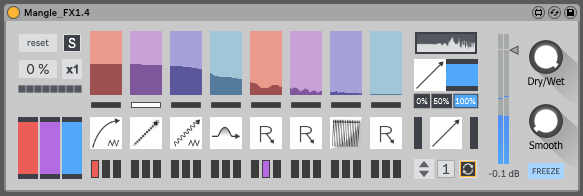 Description: The Mangle FX takes any incoming audio and mangles it through a tempo-synced multi-effect sequencer and Send controller. This has the same functions as the Manglerack, with extra control for the Sends, Wet/Dry amount and Freeze mode. Fine controls allow all out randomised chaos or subtle glitching effects. Smooth eases in and out with each section of playback if necessary to avoid clicks.