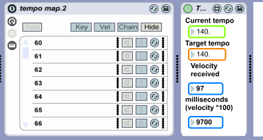 | Description: | TRamp (Tempo Ramp) Takes a note value and adds 60 (giving a range from 60 to 187) and then ramps the tempo to your target note. Velocity sets the speed of the ramp, lower values are faster. I want to set a velocity of 1 to instant but can't get that working for now (My 2nd patch so still learning the ropes). Check out the url for an associated midi rack which labels your notes to the tempo they target. This is based on the Live Tempo Automator v1.0 by Monty McMont - http://www.montysmaxpatches.com |