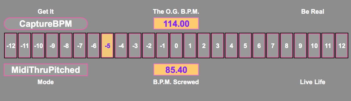 | Description: | inspired by the works of dj screw and a feature on the teenage engineer op-1 i wanted to slow down my ableton projects - in tune. this device will transpose live's master bpm in tune. in order to make this work, sound-files in live should be in warp-mode re-pitch. use it for your next vaporwave, oceangrunge or mallsoftcore track! with the help of the slave-device "Lil SKREW" midi-instruments will transpose accordingly. (see link) this is my first device, thanks for feedbacks |