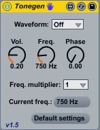| Description: | This is all which it claims to be; a simple tone generator. It allows you to generate sine and saw waveforms and provides way's to change the amplitude (volume) and the frequency. When I learned about aliasing ('Niquist theorum') I wanted to have something to try this out for myself. And this patch more than provided. Do note that the Sine and 'Saw' are aliased; the rest of the waveforms are unaliased. The reason I'm putting it online is because it managed to help me study aliasing as well as provide solid ways to test and experiment with synths like Live's Operator and Reason's Thor and Subtractor. Tip: IMO you get the best results when using this in combination with my M4LScope. v1.6: I've added several waveforms (2nd saw, pulse, triangle), removed a clash with TonegenFX and marked this 'active development' ("beta") because I have some more ideas to work out. Active development is taking place here, the main website (synthfan.info) will fall behind a bit. |