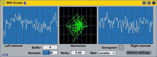 | Description: | One of the first patches I created and something I'm still using on almost a daily basis today. It's a rather simple but in my opinion also very useful patch. And it does what you see here; provides a scope screen for both channels which will show you the current waveform. You can select the buffer being used (which will give you more waveforms). Next the sample rate and draw delay can be configured which makes it easier to show specific waveforms. Finally you can also chose from 3 different presets for signal sizes; normal, smaller or bigger. As of version 1.8 it also supports sonograms; you can click the 'Sonogram' option after which a new window will be displayed. This has become somewhat work in progress; more updates are bound to follow. |