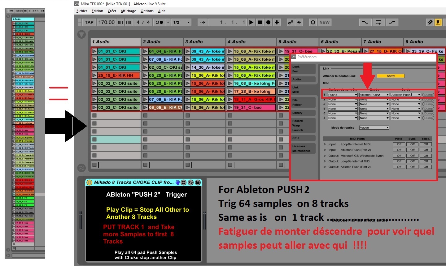 | Description: | "" Someone can confirm me if it works with push2"" ------------------------------------------------------------------------ PUSH 2 see picture first: ableton midi preference PUSH need assign as FIRST line midi surface controller and you see 8 x 8 Red rectangle and : Drag & drop PATCH Max on First track work on 8 first audio "and or midi" track but you can up and down infinitly -------------------------------------------------- For Auto Watch " Selected Clip " preference "record, warp, launch" Enable = selection at launch = sélection au lancement --------------------------------- crop and looped clip to all 64 pad Push and more on first 8 tracks session view . And Play from PUSH and re-record in Arangement view .... ........................... Is equivalent DrumRack CHOKE ........ create 8 tracks and Put Patch on First Track ... Next play more clip with push !!!! Play on clip Stop all Other !!! Support Quantize Live global setting ...... And No overlap CLIP in arrangement View Cool to remix Long live record and re-arange so ... so ... ------------------------------------------------- PUSH 1 http://www.maxforlive.com/library/device/3225/mikado-8-tracks-choke-clip-from-push |