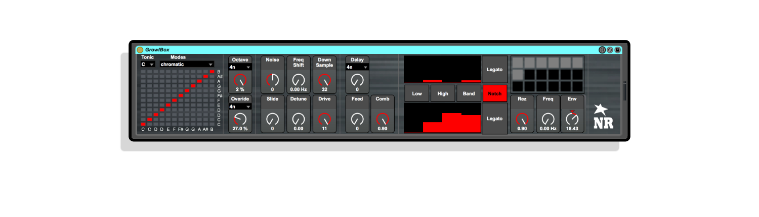 Description: Growl is a autotuning, pitch tracking comb filter and sound generator with quantized note scaling.