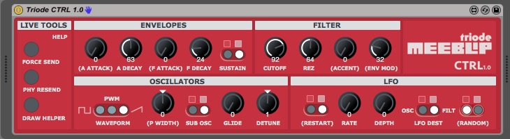| Description: | Triode Meeblip CTRL facilitates the creation and recalling of “presets” for the Meeblip Triode. The idea is to save “presets” as single value envelopes on MIDI Clips (which can also contain MIDI notes and standard automation). Then by recalling those Clips you can automate “preset” changes, undo parameter changes you may do playing live, either directly on the Triode, or from a surface controller. Besides standard controls three special functions are provided: 1) Force Send All Controls. (FORCE SEND) You should use this automated on the very beginning of any Clip that contains a Triode CTRL “preset” (in the form of envelopes) to ensure all parameters are sent. This is needed because there is no MIDI feedback from the Triode, so Live doesn’t knows which parameters could have been altered. You can automate this button or MIDI map it for remote re-sending. My advice is to use one time per “preset”. To recover only Physical Parameters (those you can access directly on the Triode) use Physical Controls Resend instead. 2) Physical Controls Resend (PHY RESEND) Useful to recover a “preset” after some live action on the physical controls on your Triode. If you didn’t change any "MIDI only parameter" either from here or from a Surface Controller (like the Push), you’ll probably want to use this function instead of "Force Send All Controllers" to avoid sending unnecessary data through your MIDI port. You can automate this button or MIDI map it for remote recovering. 3) Envelope Draw Helper (DRAW HELPER) This function helps creating automation envelopes by modulating a quick step on each parameter that can be recorded as manual parameter changes to a Clip on Ableton. - First on Ableton activate “Automation Arm” and “Arm Session Recording” for the track you are using Triode CTRL. - Then also on Ableton press the record button on a free Slot. Now while recording go to Triode CTRL and press the Draw Helper button. - Stop Ableton, go to the Envelopes on the Clip you just created, turn off the Loop, and move the Clip’s start point after the envelopes quick step. Now you can load this “preset” by Launching that Clip. This control can’t be automated. Happy controlling! Any doubt feel free to contact me by mail gbravetti@gmail.com ...or through my Facebook page http://facebook.com/gustavobravettilive |