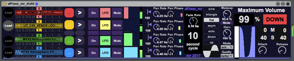 | Description: | dFreeze_mr is a 4 channel sample loop player with a 4-phase LFO to mix the channels, plus a performance-oriented fade in/ fade out section on the right hand side. Load up samples by dropping them in the boxes on the left when the 'Load' button is lit, set the LFO speed, tweak the pan controls, and then press the 'Start' button. The atmospheric effects in your samples will be gradually faded in until it gets to max volume, where it stops and waits. You can now change the samples (when the 'Load' button is lit) until you are ready to finish, then press the 'Stop' button. That's all there is to it. A simple way of automating atmospheric effects, loops, drones, etc. in live performance. dFreeze_mr is a quick rendering of an idea that I got at Loop 2017. It isn't perfect, isn't production ready, needs all sort of tidying up, etc. So it is free for you to use and see if you can find a use for it. Enjoy. Version 0.04 starts up first time with long Attack and Release times - you may want to adjust the controls to set them shorter... Version 0.05 makes a few tidy-ups and may fix some problems. |