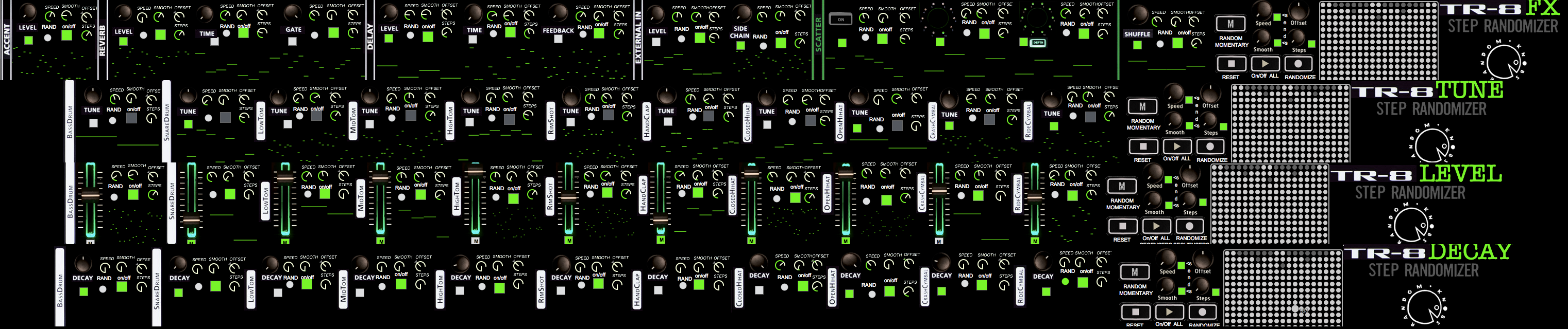 | Description: | STEP SEQUENCER FOR ROLAND TR-8 DRUM MACHINE PARAMETER CONTROL demo: https://www.youtube.com/watch?v=pWZI0Y8Es4M https://gum.co/tr8bund - fx, tune, decay & level sections https://gum.co/tr8fx - fx section https://gum.co/tr8tune - tune section https://gum.co/tr8decay - decay section https://gum.co/tr8level - level section |