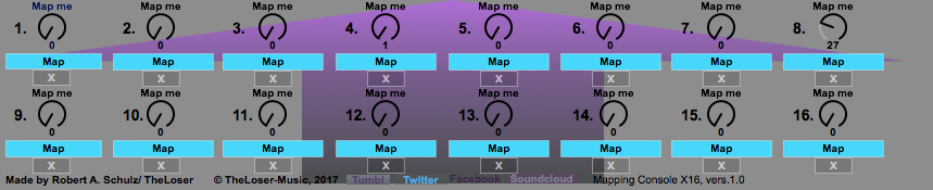 | Description: | Hi Girls and Guys, I made the last weeks this mapping device. You can assign any supported parameter of Ableton Live, third-party-plugins or as well as parameters of other Max-for-Live-Devices. You got the ability with this device to assign 16 parameters to 16 knobs/dials. Thanks for supporting me. Love you. |
