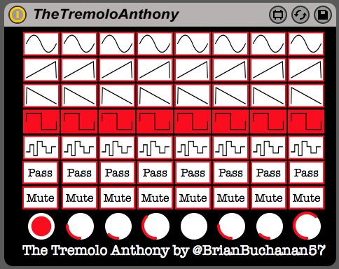 | Description: | The Tremolo Anthony is a simple, 8-step quarter note tremolo sequencer. ***Version 2.0: Now with tremolo auto panning! Just click on my name (it will turn red) to engage. Click again (it will become underlined) to flip the phase!*** Each step has a few waveform patterns to choose from: 1) Sine 2) Saw Up 3) Saw Down 4) Square 5) Random Additionally, there are options to either PASS the signal as is, or MUTE it for the entire beat. The white circles serve two roles: First, when Live’s transport is running, a red dot will cycle through the steps so you’ll be able to see which waveform you’ve assigned to which beat. Second, they act as dials to set the tremolo subdivisions (1, 2, 3, 4, 6, 8, or 16). The Tremolo Anthony is recommended on some nice pads, to give them some rhythm, or on some low, growly bass. Enjoy! Demo video coming ~eventually~ … Leave a comment if there are any bugs, or if there are any future updates you might want to see! Thanks! |