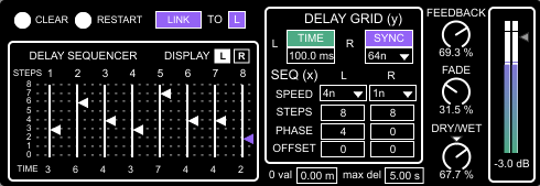 | Description: | This device allows you to sequence the amount of delay on your left and right channels with two, independent, eight step sequencers. You get control over the speed, amount of steps, phase and offset of the sequencers as well as the size of the delay grid, the steps on the y axis of the delay sequencer (0-8). Controls for the feedback of the delays, fade between the steps and dry/wet are also provided. Use the link and "link to" functions to link both audio channels to the left or right sequencer or have them run independently. The device has built in info text for more explanation. WARNING: BE CAREFUL WITH HIGH FEEDBACK! I'm going to figure out more ways to control the feedback on this device (particularly when the delay time is at 0). For now be sure to change the "0 Value" knob to not 0 before turning up the feedback to avoid feeding the signal into itself at your buffer size. There are measures in place to make sure it wont blow up or anything but it wont sound good either! I hope you enjoy and that the interface is clear! This is my first uploaded device and any feedback is appreciated! -Stevie Schmidt UPDATE: Version 1.0.1 Fixed preset storage on sliders. Any presets saved on old versions should now be remembered with the update. Last minute changes caused my initialization order to get screwed up! download more devices at: http://www.heapsofbleepsaudio.com/ |