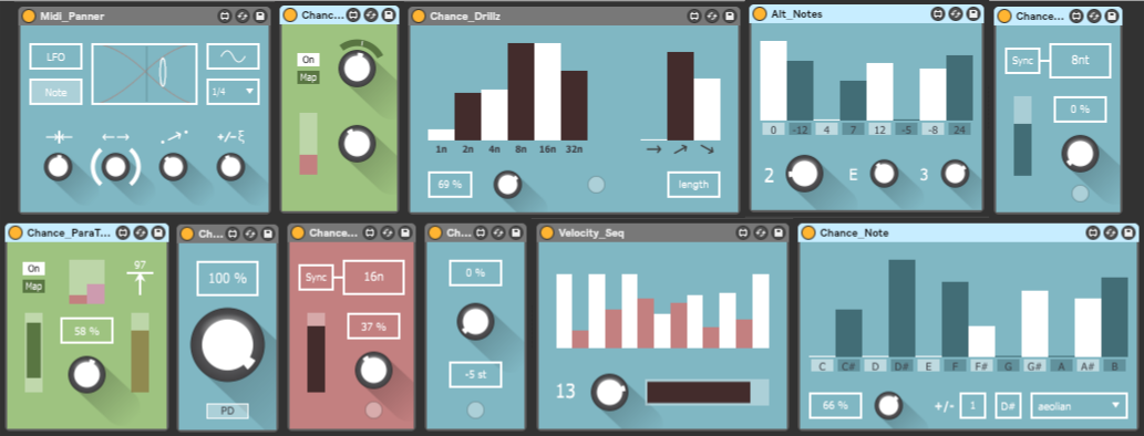 | Description: | The Chance 10 pack is a selection of probability based devices, inspired by scripts used by Brian Eno. Set the probability of any incoming midi being modified, or triggering parameter changes in your Live Set. The pack includes - Chance_Play Chand_Transpose Chance_Repeat Alt_Notes Chance_Midilay Midi_Panner Chance_Parameter Chance_ParaTrigger Chance_Notes Chance_Drill Velcocity_Seq v1.1 - Non-note Midi through for all devices v1.2 - Push ready. Fixed bug in Chance Drillz Head over to Isotonik for more information |