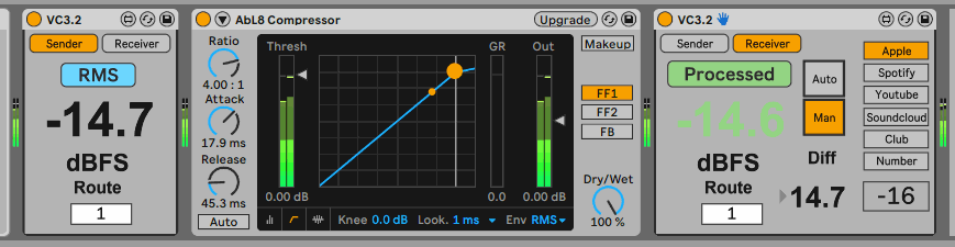 | Description: | This patch compensates volume after passing some plugins. Consist of two devices Compensator send (CS) and Compensator recive (CR). CS measures RMS and CR adjusts output level to same RMS. Put some plugins between them, make tweaks and listen changes only, no loudness increase or decrease. 3.5 Fixed bug with volume strike when effects chain is heavily clipping. Small fixes. 3.3 Updated GUI for reflecting Live's colours 3.2 Added Auto and Manual setting on Receiver Difference number between R in and S out Matching numbers on R became green 3.1 Single file patch 3.0.1 fixed No sound when transport is inactive, fixed routing 3.0 Added LUFS metering, Routing incteased to 30 channels. Small bug fixes. 2.0 New clear GUI, now possible to bypass all processing whatever it contains (native, M4L, VST, AU), Matched RMS now becomes green on Receiver, small bugfixes. 1.1 Added 5 groups to use in one project Added video how to use plugin as reference tool https://youtu.be/3QIeBzhvg2k Simple video https://youtu.be/RNA9aqhr-_s maxforlive doesn't allow to upload zips. so grab device on gumroad link If You have any questions, contact me via mail. |