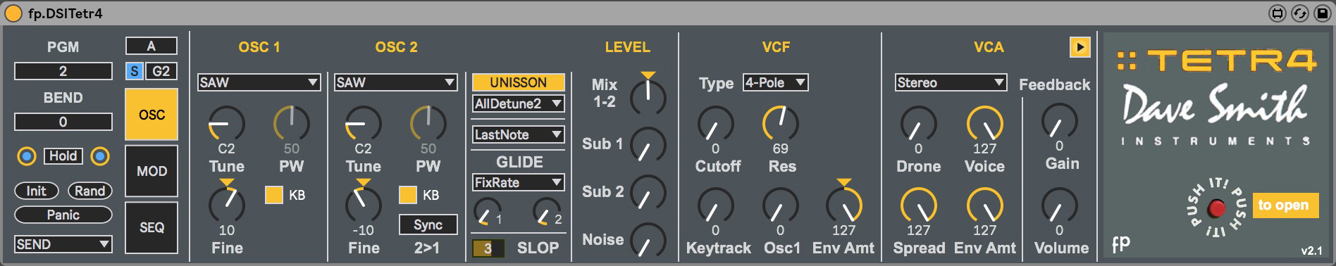 | Description: | Dave Smith Instrument Tetra hardware control. Configured for NRPN mode. Please adjust your setup. Polyphonic mode only, no Combo yet. Multi is possible but tricky. |