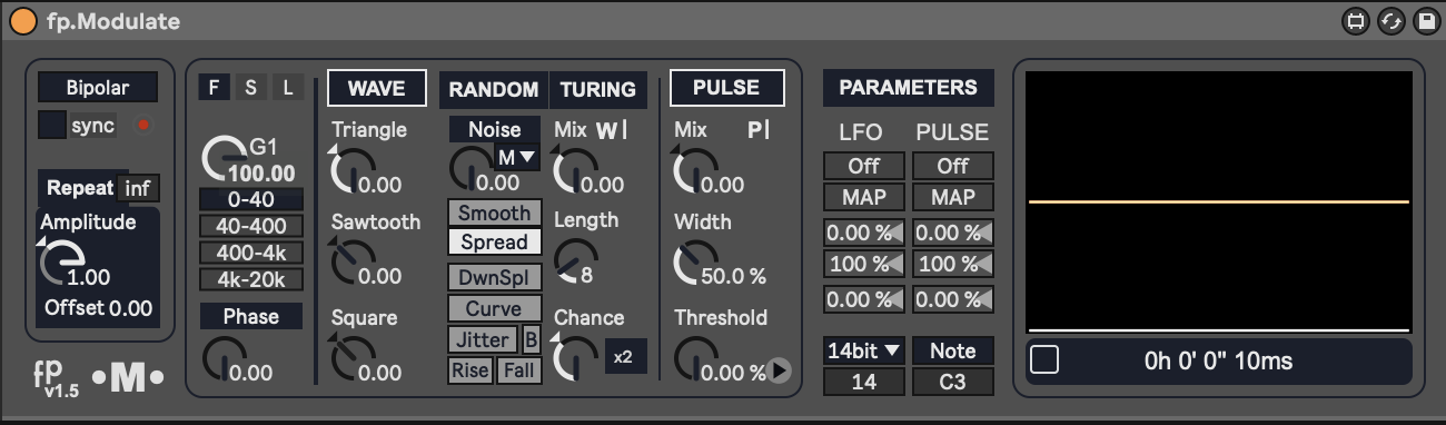 | Description: | This is a combo of quadrature oscillator / LFO, envelope & burst, Turing Machine, sequencer, randomizer and oscillator with a morphable (not mixed) waveform. Features: - Range 0-20kHz - free, synced or locked. - Midi input (pitch, velocity, sync). - Oscillator : amplitude and offset (bipolar & unipolar), phase controls. - Morphing : triangleness (from sine wave to spike), sawness, squareness. - Shaping : downsampling, curve, jitter, binary, rise and fall. - Random (level, smooth, and probability spread) applied on main waveform by crossfading or amplitude or ring modulation. External source is possible instead of internal noise. - Turing machine - Gate/trigger : amplitude, phase, crossfade with Turing machine gates, width, probability. - Cycle from 1 (envelope) to infinite. - 4 oscillator outputs (0°, 90°, 180°, 270°) + 4 gate/trigger outputs (0, 90°, 180°, 270°). - Mappable oscillator & pulse main outputs. - Midi outputs : oscillator to CC, pulse to midi note. https://youtu.be/cjHZq_jZA9s (not all the features are covered in this old version) fp.RingMod, fp.Quantize & fp.Calibrate included Tested up to OSX Ventura / Live 12.1.5 / Max 9.0.5 / Apple silicon ok. It should work on Windows too... |