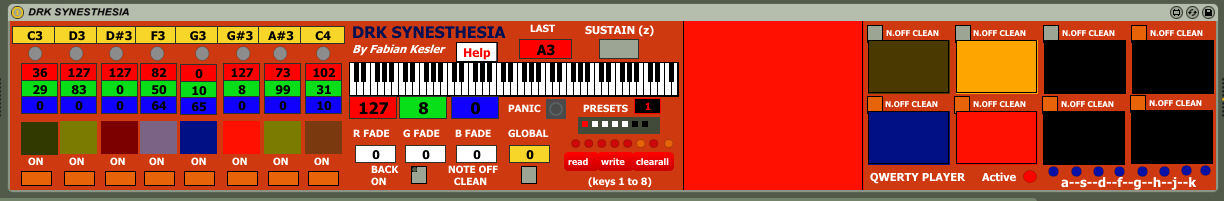 | Description: | DRK. SYNESTHESIA Note: Examples Ableton files and stand alone Mac-PC version can be downloaded here: https://archive.org/download/DRKSERIES/DRKSYNESTHESIA.ZIP Video: https://youtu.be/KJxZIWmmzsw THIS SOFTWARE TRANSLATES MUSICAL MIDI NOTES TO A COLOUR, CREATING A HARD AND EXACT CORRESPONDENCE BETWEEN THEM. ALL THE CONTROLS CAN HAVE AUTOMATION ON ABLETON LIVE. YOU CAN USE UP TO EIGHT NOTES TO TRANSLATE. EVERY ONE HAS A COLOR CONSTRUCTOR WITH RED, GREEN AND BLUE COMPONENTS TO MIX IN ORDER TO GET THE COLORS. CHOOSE THE MIDI NOTE WICH WILL BE REVEIVED ON EACH ONE. YOU HAVE AN ON-OFF SWITCH ON EACH NOTE TO ENABLE IT OR NOT TO TRANSALTE TO COLOUR. YOU CAN PLAY WITH MOUSE OVER THE VISUAL KEYBOARD, VIA MIDI ON ABLETON OR IN STAND ALONE VERSION CHOOSING MIDI INPUT FROM THE MIDI IN MENU. AND YOU HAVE A VIRTUAL KEYBOARD WITH THE KEYS a-s-d-f-g-h-j-k. IT ALWAYS PLAYS THE SELECTED NOTES TO BE TRANSLATED TO COLOURS. CLICK “ACTIVE” TO MAKE IT ACTIVE WHEN USING ABLETON. THERE ARE 8 PRESETS WICH CAN STORE DIFFERENT CONFIGURATIONS. CLEARALL: ERASES ALL DEFAULT PRESETS WITH CTRL+SHIFT ON THE DESIRED BUBBLE YOU CAN SAVE A NEW PRESET WITH WRITE YOU SAVE YOUR PRESETS, WITH OPEN YOU LOAD A PRESET FILE. YOU CAN CHOOSE PRESETS QUICKLY WITH 1-2-3-4-5-6-7-8 KEYS. CLIKC INSIDE THE WINDOWS FIRST ON ABLETON, OR DIRECTLY AUTOMATE THEM INSIDE ABLETON AUTOMATION KEYS. FADE: ALLOWS COLOUR TO APPEAR SLOWLY. YOU CAN REGULATE THE FADE TIME IN GLOBAL MODE OR FOR EACH COLOUR SEPARATELY. IDEAL FOR PAD, SLOW ENVELOPE SOUNDS. BACK ON: SOFTWARE BACKGROUND IS ALSO TRANSALTED TO COLOUR. NOTE OFF CLEAN: WHEN THE MIDI NOTE GETS ITS END, THE COLOR ALSO FINISHES AND BACKS TO BLACK BOTTOM. THE TRANSALTED RESULT IS SEEN ON A GLOBAL WINDOW AND IN SEPARATES WINDOWS,ONE FOR EACH NOTE. EACH WINDOW HAS THE “NOTE OFF CLEAN” OPTION SEPARATELY. PANIC: USE IT IN CASE OF STACKED NOTES. SUSTAIN (midi sustain cc64): WELL FOR TOUCHING A NOTE QUICKLY BUT GETTING A SUSTAINED SOUND, THUS A SUSTAINED COLOUR. TIP ON USING PIANO ROLL TO WRITE NOTES: LEAVE A MINIMUM SPACE BETWEEN NOTES IN ORDER TO GET LINEAR RESULTS. SOME MILISECONDS IS ENOUGH. WATCH THE ABLETON EXAMPLES. STAND ALONE VERSION HAS MIDI MENU FOR INPUT AND OUTPUT, AND ITS OWN SYNTHESIZER, WICH YOU CAN USE (BASED ON FLUYDSYNTH). YOU CAN CHOOSE FROM 128 SOUNDS FROM THE INCLUDED SOUNDFONT. LEAVE IT ON THE SAME FOLDER AS THE APP. WINDOWS: USE EXE OR MXF FILES MAC: USE MXF FILE I DON’T HAVE MUCH TIME TO CONTINUE IT WITH MORE FEATURES. IF YOU ARE A PROGRAMMER ANS WANT TO DO IT PLEASE FEEL FREE TO DO IT AND CONTACT ME FOR SUPPORT IF YOU NEED IT. Fabian Kesler fvkesler@gmail.com More M4L plugins, video-tutorials: www.fabiankesler.blogspot.com fvkesler@gmail.com |
