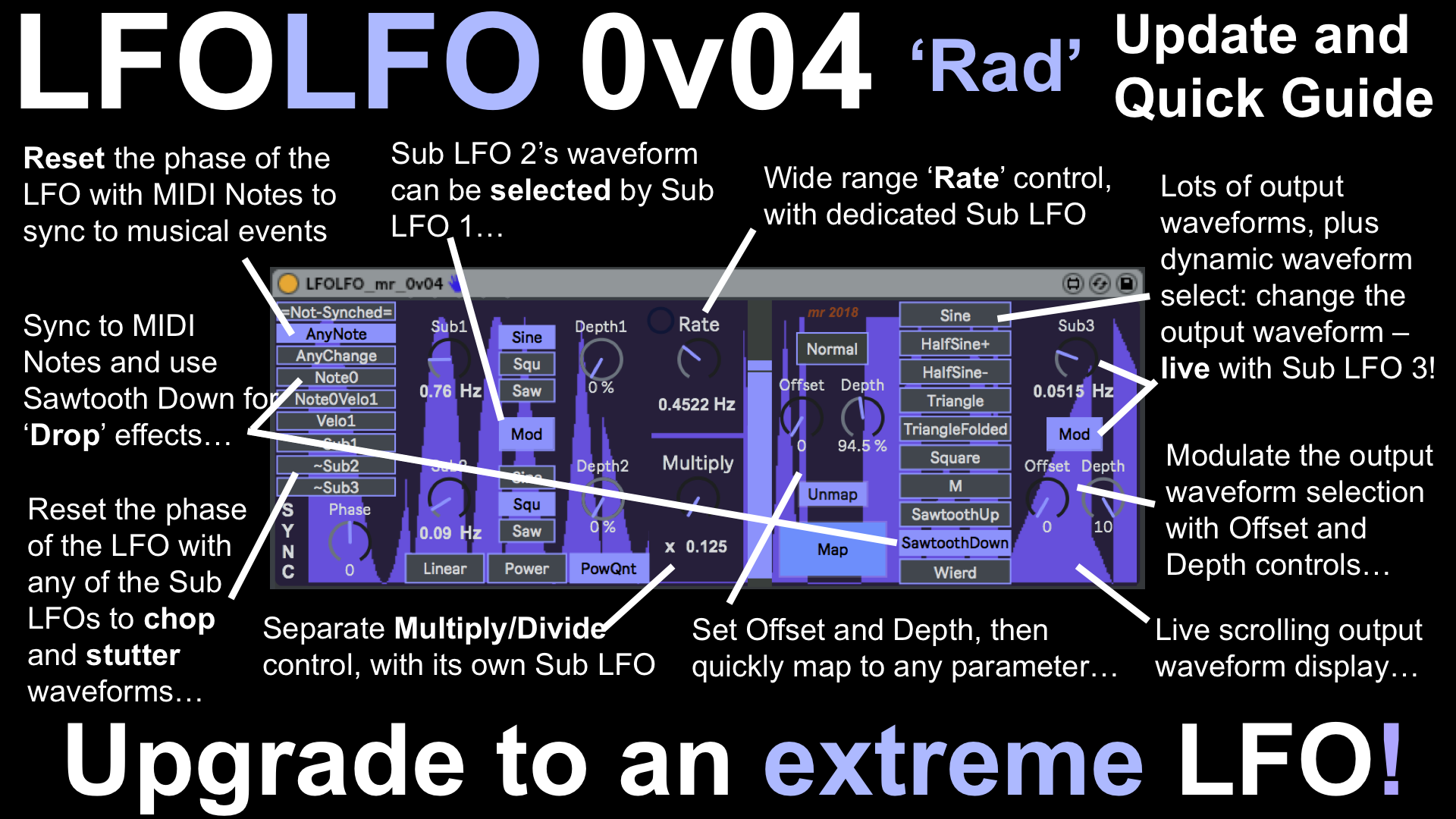 Version 0.04 is a quick intermediate release whilst I do some tidying up internally, but it adds in my experimental 'Event Sync' where you can reset the main LFO's phase using MIDI Notes or the Sub LFOs, which should make it quite versatile in creating a range of useful live modulation effects. I'm trying this as an alternative to synching to Live's Transport. Output waveform selection has also been improved, but there's more flexibility coming in that space soon.