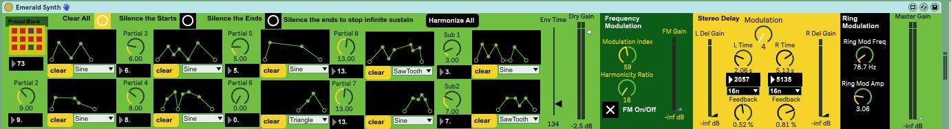 | Description: | Two words: No Clicks!! https://soundcloud.com/kylehinton/emerald-synth-demo Emerald Synth is a monophonic, additive synthesis instrument, with frequency modulation, stereo delay, delay modulation and ring modulation. Get nothing put pure, luscious, additive synthesis sounds from the ten oscillator engine! Sculpt the envelope of each oscillator to have surgical control of how your sound is delivered and choose the waveform for each. You can even let the release happen infinitely unless you hit the "silence the ends" button. Each oscillator has a frequency multiplier for you to create dynamic layers of frequency. When you shift the number, beneath each oscillator, you are essentially multiplying the input pitch by that number. Integers (point 0) will always give you harmony while it might be a little more difficult to find it, with decimals. |