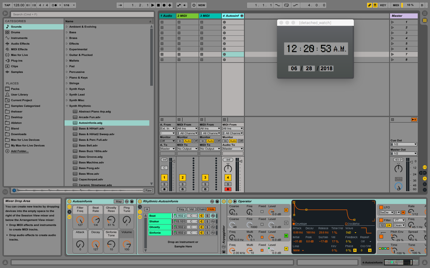 | Description: | I like to use Live in Full Screen Mode, doesn´t matter if I´m using it on my MacBook Pro or on my Windows 10 PC. The Problem is, I be always not able to keep the time literally “in eye”. I was just trying to mix or make something from scratch, dive a little more bit into it, but then I realise when I watch back on a clock in the room that several hours were past. Indeed it´s possible to switch ever and ever again to the main desktop and look there onto the task or menu bar to find out the time. You can also set up a clock just on your desktop beside your computer, but it is much better to just access the time information directly inside of Live even more when you are at tour or just creating music on a laptop. That is for what this device is created. The cool thing on this device is that you can show up or detach a floating window of the clock and you´re be able to place this little window onto your screen, and can see it even if the track in which the device is inserted is not selected like it is seen on the screenshot photo above. Important: The floating window stand only than alone on screen, even it´s inserted track isn´t selected, when Live is run in Full Screen Mode! Note: I´m not a professional programmer and so on issues can occur because I didn’t have the expertise on all doings i want to make. The device is for free, but any donations are welcome. Features totally: - Time Monitor (in 24 hour and 12-hour (a.m./p.m.) mode). - Date Monitor. - Pass through audio and midi data (Data isn´t affected). - Mainly compatible to MIDI tracks, but it can passes through audio as well (when set after an instrument device/plugin). Note: the result of the device is very depended from your hard- and software settings. Tested on MacBook Pro under macOS Sierra with Ableton Live, Version 9.7.6. |
