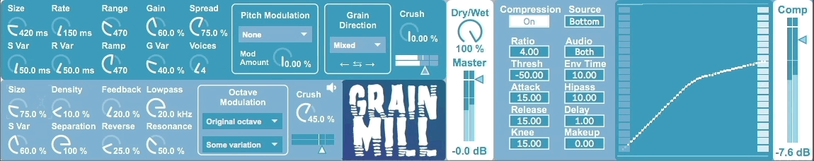 Version 2.1 update: added sidechain compression because why not. Click the Grain Mill logo to open the compression section. You can use either the bottom or top section to compress the other, of if you select "both," the dry audio will be compressed by the grains. It's so pointless.