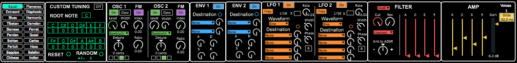 | Description: | Polyphonic FM synth with tuning options. Updated version includes a new GUI, modulation envelopes, improved LFO section, more modulation parameters, oscillators no longer read from buffers which caused aliasing. The custom tuning has been adapted slightly from the Phase Distortion synth by Martin Pechmann. Big thank-you to Roman Thilenius and Cptn Fantasy for tips on CPU efficiency and routing improvements. The restart via gate option on the oscillators is an area I have battled with... https://cycling74.com/forums/non-cycle~-oscillator-phase-restart-and-specification ...this option is still not exactly how I think it should be. EDIT : Live/Max versions newer than those used to create the device introduce a bug which prevents lfo/envelope depth dials being modulated by lfos. |