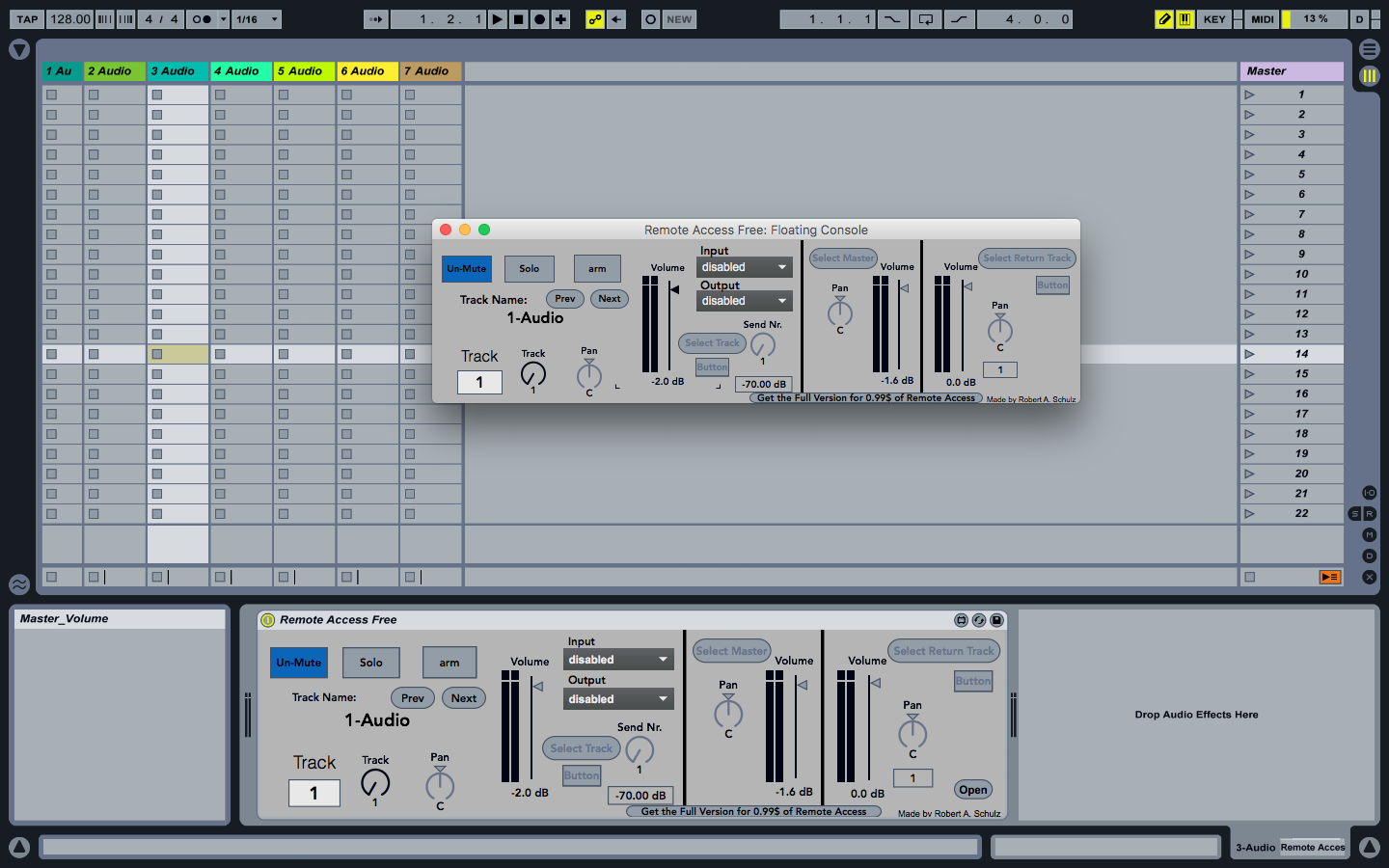 | Description: | This is the lite and free demo version of my Remote Access-device. the functions which work: - Track Selector. - Select Track on Screen. - Volume adjustment for chosen track precise simultaneously and logarithmic to Live´s amplitude scale from -70dB (-inf) to +6dB (unlike its done on other derivates where you just got a scale between the values 0.* and 1). - Mute chosen track. - Solo chosen track. - Arm chosen track. - Master Volume adjustment. - Floating Console. the restrictions are: - Pan for Track is disabled. - Send-Selector for track is disabled. - Send-Volume for track is disabled. - Input-Routing disabled. - Output-Routing disabled. - Track Select on Screen is disabled. - Button/Trigger mode for Track selection is disabled. - Select Master Track on Screen disabled. - Master Track Pan is disabled. - Return Tracks Selector is disabled. - Select Return Track on Screen is disabled. - Return Track Pan is disabled. - Return Track Volume is disabled. - Button/Trigger mode for Return Track selections is disabled. What is Remote Access? Remote Access is a Max-for-Live-Device which is designed to jump over a terrific step, when mixing music and especially to adjust track parameter over and over again which lays places from your actual setting of making music away and after you had to navigate to that special parameter, it has costs you a lot of time, nerves and nevertheless creativity, too. With this device you can control track parameters from other tracks directly from the device chain you´re working on (more photos under the link below). You also got the ability to use Remote Access as separated floating window and place it wherever you want on your desktop. ( I recommend this works best when you using Live in Full Screen Mode.) What does the device exactly? The device is mainly designed to tweak track mixer parameters from your current selected track (the track you´re working on). The GUI is divided into three areas: The Track-Area, which is ment for usual Audio-and Midi-Tracks, the Master-Area, which is ment for the Master Track and the Return-Area, which is given for toggling Return-Track mixer parameters and states. You can mute, solo, arm, pan, adjust the volume and the sends for a chosen track which is selected with the Track Selector. The Track-Selector is given on usual Audio-or Instrument-Tracks as dial or slider. The dial is easier to use when you like to tweaking with mouse or touchpad. the slider I personally use more to type in directly the number of the track, which you wish to change its parameters or to look on which track i am operating with this device. If you don´t like to ever targeting you desired track with the slider or the dial, than you can just click on the “next” and “prev”-buttons, which steps you one track for-or backwards in track count. You can also change the input and the output of a track by remote using. Select the Send-Knob you wish to tweak with the Send-dial and than adjusting the amount of send-signal which should go into the relative return-track. You can also jump or set the focus from your actual track to that desired track, by clicking on the “Select *Track”-button. The “Select *Track”-button itself has two functions of its own. you can use it as a button (which makes more sense when inserting Remote Access in the device chain) or as a toggle (which is great for use when you placed the floating window on screen). The development of this device isn´t finished at all. with the time i want to increase functionality because I also use this device for my own productions. All future updates are for free for those who bought a licence once. With the licence comes automatically support from me if you got questions, bugs or any feature wishes for future updates. the Remote Access-device has a size of 874.2 KByte. |