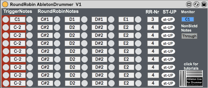 | Description: | THIS VERSION IS DISCONTINUED BUT NEWER VERSION AVAILABLE AS PART OF A BUNDLE HERE: https://isotonikstudios.com/product/ableton-drummer-collection-one/ Check out this vid to find out what the device can do for you: https://youtu.be/6ss1RhWpV-w This Max for Live device let you set up Round Robins quick and easy. It can be used for the typical purpose of triggering different drum samples with one MIDI note e.g. to make triggered drums sound more natural and acoustic. But it might be used for playing tonal sequences just as well. Get the device here https://gum.co/AaSJp OR! get this + all premium M4L devices from AbletonDrummer for 'free' if you become a Patron here: www.patreon.com/abletondrummer http://www.abletondrummer.com |