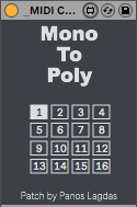 | Description: | This device is a usefull tool for those who want to use monophonic synths in a polyphonic fashion. How to use: 1. Load this device before your monophonic synth. 2. Group the synth and the device to an instrument rack 3. Go to the chain section of the rack 4. Duplicate the first chain 5. Assign the Mono to Poly device to the next available voice 6. Repeat as many times as needed. How the device works: This device allocates notes to different voices and filters the input notes per voice. As an example, if one note is present, then this note is going to be allocated in the first voice. If a second note is played before the first has ended, then the second note is going to be allocated to the second voice and so on. This can be done up to 16 voices. |