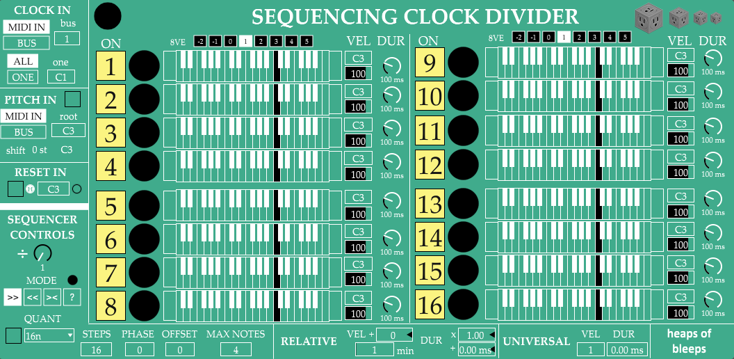 | Description: | This sequencer has a built in clock divider which runs on midi note inputs. This allows you to use any rhythm you want (polyphonic too) to run the sequencer. You can also make the pitches you input transpose the pitches it outputs. This device is great for interesting generative rhythms and melodies that can change with the turn of a knob. This is the final device of the series which includes the Sequencing Clock Multiplier https://gum.co/COZJj , Floating Clock Multiplier https://gum.co/jvpmV and Integral Clock Divider https://gum.co/PYEAcT Details Clock Dividers This 16 step sequencer runs by receiving continuous midi note inputs acting as clock inputs. Depending on the division you set, the sequencer will output a step every so many midi inputs. At a division of one it will play every note, at 4 it will play on the first note, then rest for three notes and repeat. Playing an 8 note chord multiple times will count as a 8 clock ins per chord and will result in 2 steps being played per chord (with the division still set at 4). This division is graphically displayed at the top of the clock divider by the moving white bars. When these bar finish its cycle and moves from far right to far left the sequencer will output. Input This device can either receive midi input from the midi track in which it resides or it can receive it from an external midi bus, depending on whether you're using the “Midi In” or the “Bus In” feature. The “Bus In” feature is compatible with Ableton's “Max Midi Sender” device from their Max 7 Pitch and time Machines pack or my free “Heap Midi Sender” device. This device is basically the same but has more channels, is less user friendly, and can send individual notes. The input doesn't have to be steady which can give you interesting results. You can also set it to receive one note instead of all notes with the “All/One” tab. This way you can control multiple sequencers from the same track. (Hint: Pair this with the Sequencing Clock Multiplier, Floating Clock Multiplier and Integral Clock Divider for maximum fun) Pitch In When the pitch in toggle is active, the pitches of the steps are modulated by the pitches of the incoming midi notes. Reset In When the reset function is on, you set one note that will reset all of the sequencer and clock divider. On hot mode, this happens immediately, on cold it happens on the next clock in. Sequencer Controls Control the amount of steps, phase, offset and direction of the sequence. Quantize the output to Ableton's timeline, and limit the maximum amount of notes it can play at once. Note that this device can only quantize midi backwards so quantized inputs will output one quantized beat division late. Step Controls Control of pitch, velocity and duration of individual steps, with global and relative control of velocity and duration. Pop Out Access the pop up window by clicking the “Big” button. Use the pop up window to play this device more musically with keyboard interfaces for control of pitch instead of knobs. For more specific instructions, mouse around the device, there's built in info text about specific parameters. Push Integration Parameters automatically map to Push in clearly labelled banks. Demo Videos: https://www.youtube.com/watch?v=pw1xEvY48xs&t=30s https://www.youtube.com/watch?v=mg85hYD8Od8&t=6s Made to work with: Floating Clock Multiplier: https://gum.co/jvpmV Sequencing Clock Multiplier: https://gum.co/COZJj Integral Clock Divider: https://gum.co/PYEAcT Heap Midi Sender: https://gum.co/dWKoS Buy these devices together at a discount in the MIDI clock pack: https://gum.co/ssfUq |