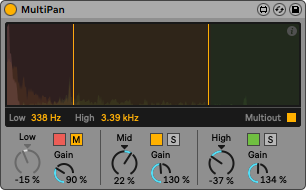 | Description: | MultiPan is a three band, multiband panner, where you can pan (or convert to mono) your audio's three bands (low, mid and high) separately. You can set the low frequency (operates below that frequency) and the high frequency (operates above that frequency). The band between these two becomes mid. You can mute the bands and also, there is an extra gain control per band. Besides the controls, you have a phase scope, a correlation meter and a master meter, with indicators of clipping. https://www.youtube.com/watch?v=SLMAD2nW1wU Version history : 1.o1 - Ableton banks support added for Push 1.o2 - save/load bug-fix + multichannel output 2.oo - bugfixes, UI update 2.o1 - UI glitch fixed, device now follows correctly the selected Live theme 2.o2 - minor tweaks 2.o3 - Apple silicon check 2.o4 - dynamic UI 2.o5 - Live 12 compatibility check |