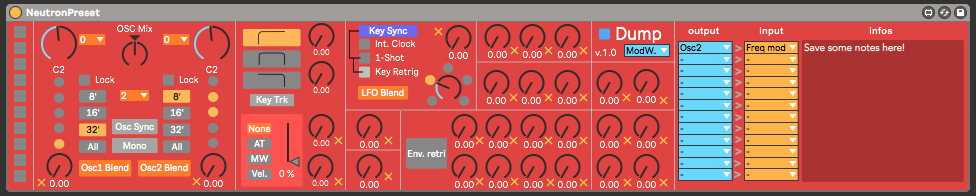 | Description: | This M4L midi device is a plugin version of the official Neutron app. It's allows you to save your Behringer Neutron patches as visual presets in Ableton Live, but also recall any parameters that can send sysex to your Neutron. Knobs are just visual elements, they act like a patch memo/sheet. Buttons and menus control your hardware via midi (but it's one way only i.e your hardware doesn't control the M4L device) and are automatable and saved too. Ableton Live 10 minimum. Make sure you're using Max 8.0.2 minimum (otherwise you might not see the oscillators' big knobs correctly) Neutron firmware v2.0 minimum. Release notes: v1.1: - Fix sysex output issue for some users. - GUI tweaks I consider 3€ to be a fair price but you can GRAB IT FOR FREE BY USING THE "free" DISCOUNT CODE WHEN ORDERING, or pay more than 3€ if you want. Enjoy! Gumroad emails could be considered as spam, so please make sure to authorise it in your email settings if you want to be sure to automatically receive future updates. |