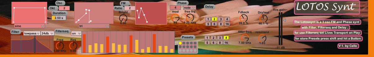 | Description: | LOTOSsynt is a 3osc Fm+Phase Synt whit Filter Filterseq and Delay. Presets inc. I ts my first Max Synt i start to lerning max. Updates wil coming... lock also the LOTOS Fx an Audio Effect very funy |