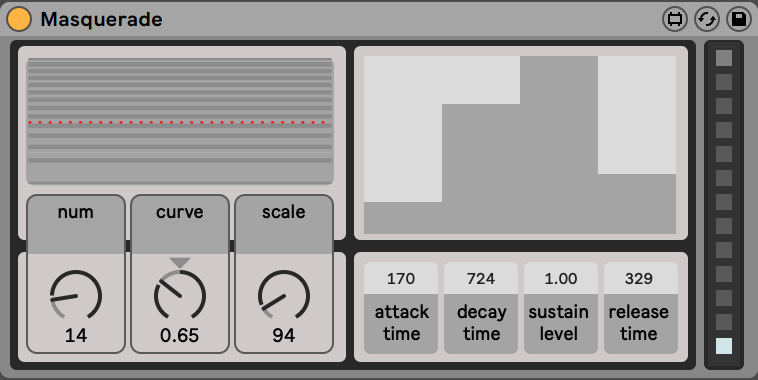 Usage: drop Masquerade onto any MIDI Ableton Live track and play your MIDI controller to produce the sound. Change ‘num’ dial to set the number of sine oscillators (2-64, default: 4). Use ‘curve’ dial to change how the oscillators are distributed across the centre pitch (0-2, default: 1). Values close to 1 are producing linear distribution. Values close to 0 or 2 are producing logarithmic distribution. You can monitor how the oscillators are distributed in the Masquerade OSC distribution monitor: the centre pitch is displayed as a line made of red dots. The oscillators are displayed as dark grey lines. You can scale the centre pitch up or down by using the ’scale’ dial (0-100, default 300). Use the traditional ADSR to further sculpting the sound. Attack, Decay and Release are time in ms (0-1000), Sustain is a level (0-1). Save up to 13 combinations of ‘num’, ’curve’, ‘scale’ and ADSR in the Presets section. Shift-click the slot to save a preset, click to restore the preset.