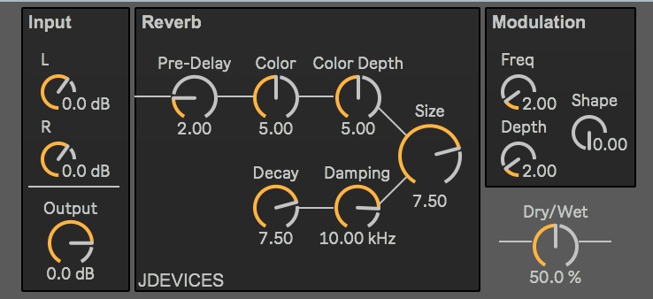 | Description: | Video: https://www.youtube.com/watch?v=pDv-oew2E54&feature=youtu.be Fox Verb is a reverb with realtime controle over all parameters. Based on the Dattorro reverb algorithm. This devices goes from spring or plate reverb sounds to big halls. By adding modulation the device can also sound like a chorus or phasor or somewhere in between. With the colour knobs the user can shape the room and materials in the room. By setting the decay knob to 10 'infinite' reverberation can be achieved. Knobs: Input/Output - Set the input and output levels. Pre-Delay - set the delaytime before entering the reverb algorithm Color - Adjust the room shape/material Colour Depth- How much the room is shaped Size - Change the size of the room Damping - Cut the high frequencies slowly using a Moog Ladder filter Decay - Set reverberation time. If set to 10. The reverb will go on indefinite. Check my other plugins: https://gumroad.com/jaromir |