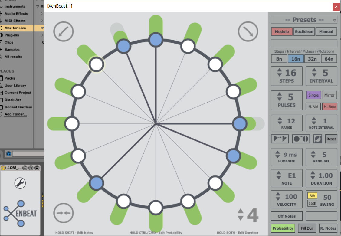 | Description: | Xen Beat is a circular algorithmic sequencer based on the unique Modulo algorithm for generating rhythmical sequences. It also has Euclidean mode and complete manual control, and includes plenty of randomization and probability options. It comes packed with presets from traditional world rhythms to spark your creativity. You can modify each individual note, velocity, duration, and probability per step, and introduce humanization of the note onset and velocity level. There are also handy controls to subdivide the steps, double the sequence, auto-generate velocity and note values and invert the pulses. Works with Live 9 & 10. Check out the full walkthrough here - https://youtu.be/x0HKPc8pfYo v1.1 - Now has 8 instances of the device, for individual control of notes, polyphony and maximum chaos! v1.1.3 - Each sequence now has a Mute and Solo button v1.2 - Fixed minor issues with the reset button |