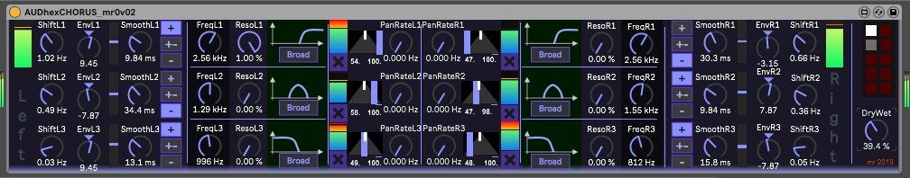 AUDhexCHORUS is a stereo spectral chorus, with six chorus blocks, three spectral bands per channel, stereo pan position and modulation control (via a new UI widget) and envelope-controlled chorus depth. This is a 'wide' device, and gives a variety of chorus effects.