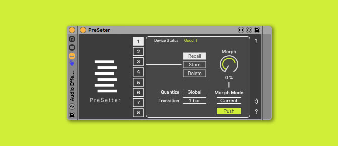 | Description: | PreSetter is a handy device for live performers and music producers that allows you to control the macros of a rack device, and create up to 8 presets which they can be controlled in various ways. - Store, recall and delete presets. - Morph between two or all presets by mapping a CC to the Morph Mode parameter. - Create timed transitions between presets using Quantize parameter. - Control the duration of the transitions by setting the Transition parameter to your preference. - A smart integration between the device and Push 2. Note: For those who try to use the Push 2 integration and the encoder touch doesn't work, this is a known bug, which I personally reported to Ableton, and has to do with the Push 2's script. The workaround is to simply get in and out of user mode once, once you open Push and Live. |