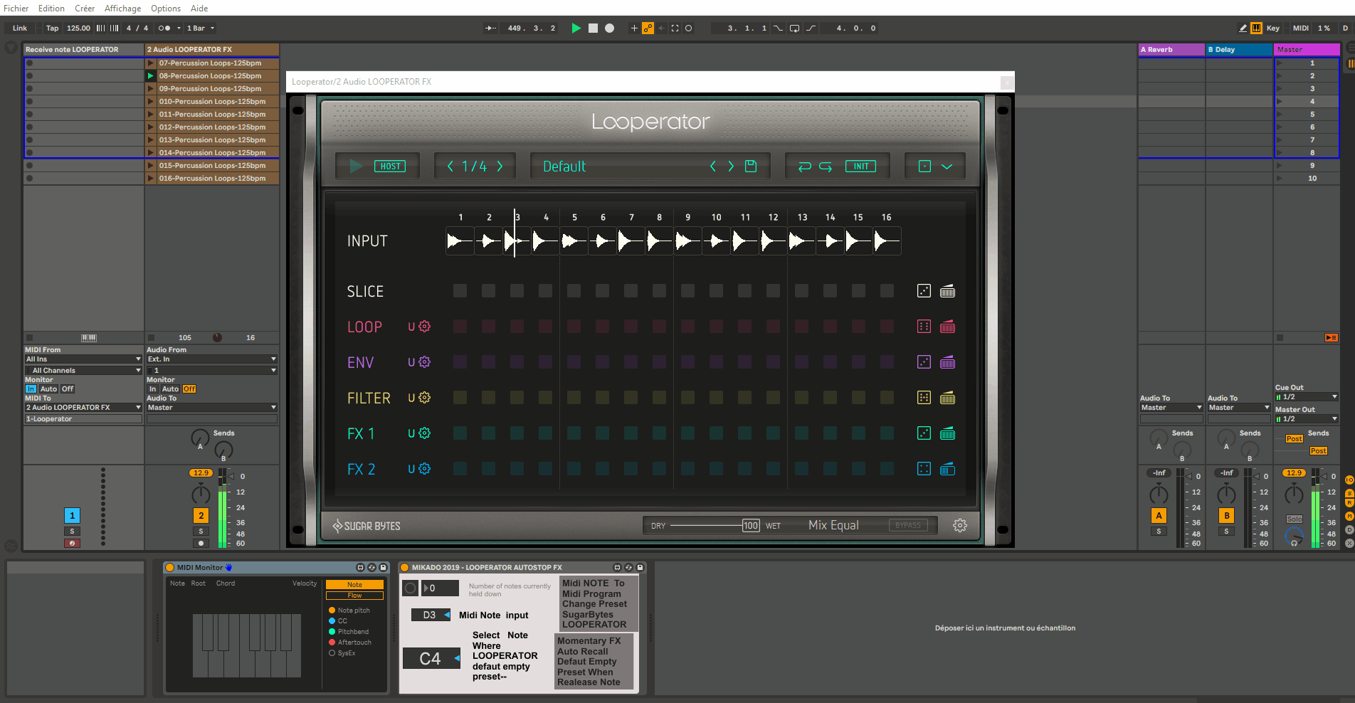 | Description: | Utility for SugarBytes LOOPERATOR Looperator can receive program Change From Midi Note I have made this patch For use as Momentary FX Put this Patch on midi track receive Midi note -------------- make an program midi Bank on LOOPERATOR and make one defaut preset with No FX exp: note C4 and select in my patch what note (C4) to recall this preset when release note latch --------------- Now Looperator is momentary Break FX Cool |