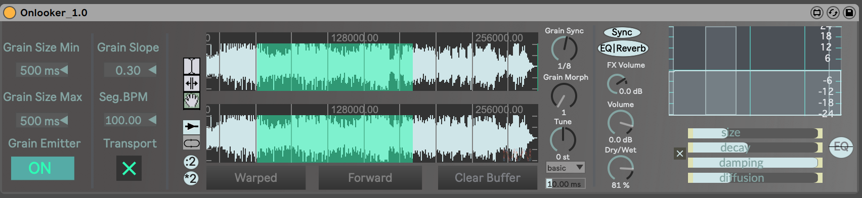 | Description: | Onlooker is a granular sampler that allows you to quickly squeeze and mangle your sounds or send them to heaven and beyond. Included with Onlooker is easy to dial-in sample looping and warping, grain morphing, buffer reversing, and fast transposition. a handy dry/wet allow you to remix previous material on the fly, while a large plate style reverb and musical EQ can shape your material in infinite ways. Sync your grain playback to Ableton Live's clock, or define a grain range and see what ghosts you can find in the machine. Check out the video below for more details on functionality: https://www.youtube.com/watch?v=j8mUdPduWuk&feature=youtu.be |