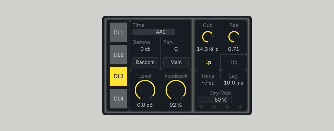 | Description: | Delay Chain is an audio effect that uses four delay layers, where time values are only defined using musical notes. For instance, if the selected note is A3/440 Hz, time will be equal to 2.27 ms, which corresponds to its period. Add notes and chords to percussive sounds or compose complex patterns by setting a group of simple automations. Each layer has its own level, feedback and time configuration. Their individual outputs can also be routed to the next layer before going directly to the main output. |