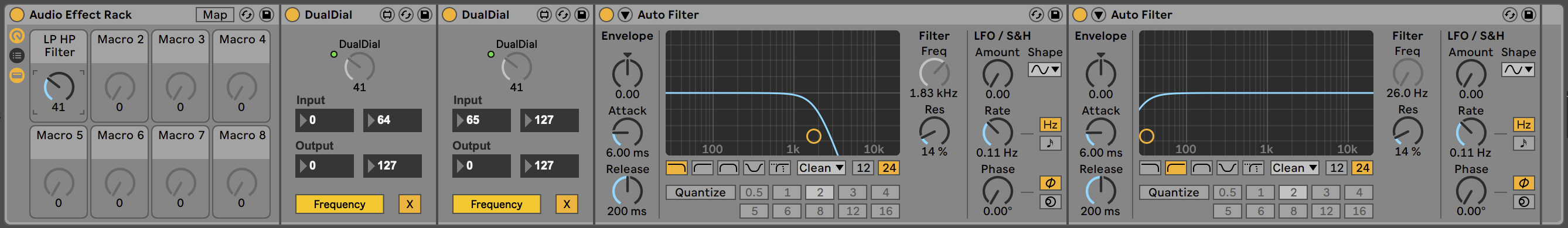 | Description: | Listen only to specific ranges on a button and covert the range into any other. Use it to create different zones on one dial. I use it to create a single knob low-highpass filter. How to: Lowpass-Highpass single dial filter: Use one instance of this device and map to a lowpass. Set input to 0-64 and output to 127. Map second instance of this device to a highpass. Set input to 65-127 and output to 127. Map both devices to a single button. Basically the lower half of the button will close the lowpass, the upper half of the button will open the highness. |