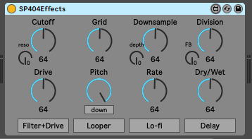 | Description: | This device emulates some of my favorite effects on the Roland SP-404. Designed to be mapped to a midi controller and performed with. Buttons labeled with given effects toggle them on and off with no trails and dials above those buttons will control given parameters. Have fun and let me know about any changes you would like to see! Works great with the LPD8 - you could even use a simpler for the pads to make a "404 Mini"! |