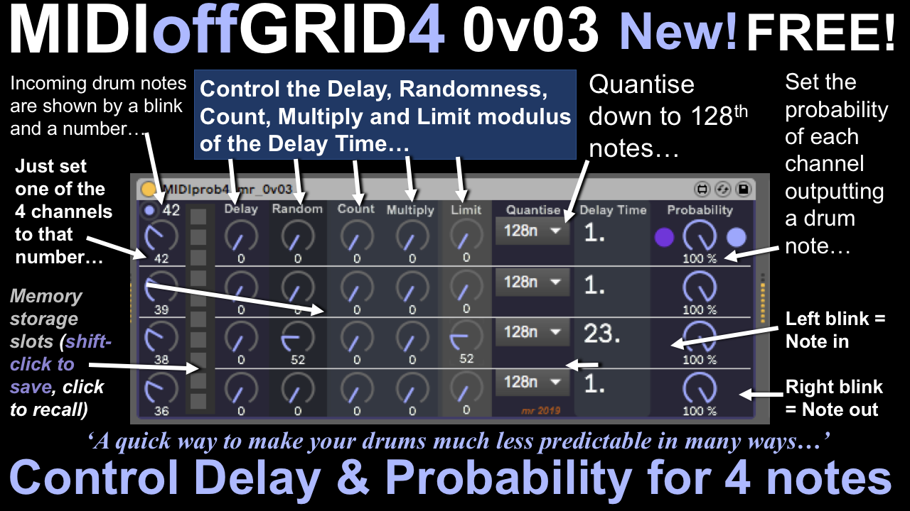 Description: MIDIoffGRID4 is a four channel time-delay and probability controller that affects only four selected MIDI notes. You have comprehensive control over the time delay (Offset, Randomness, Counter, Limit (modulo)), Quantisation and Probability of a note.