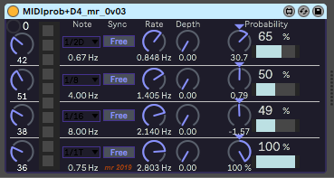| Description: | MIDIprob+D4 adds 4 LFOs so that each channel's probability can be modulated over time. The probability of a drum sound can now vary from moment to moment. MaxForLive.com doesn't allow the use of a '+' in the name of a device, so MIDIprobPLUSD4 is used on the site... This is part of a series of M4L devices that play with the probability of drum events. The mechanism I use doesn't seem to always blink the indicators correctly, so you could say that the unpredictability is undisplayable! |