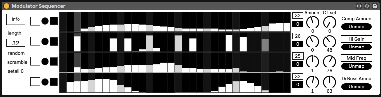 | Description: | A 4 track step sequencer for modulating any Ableton MIDI Device parameters. You can use many instances in the same Ableton MIDI track to control more parameters, including those from the " Inceptor Sequencer " (i.e. track lengths). " Inceptor Sequencer " is also in maxforlive.com This device comes with instructions in the "info" button. UPDATE: Added left/right scroll buttons for sequences |