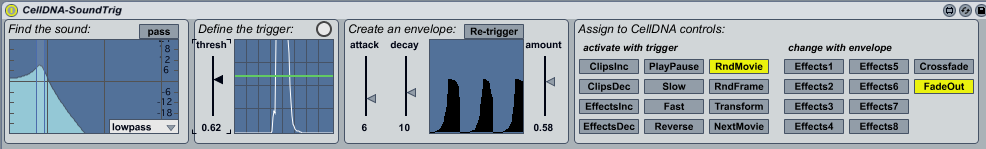| Description: | CellDNA-SoundTrigger provides a filter and interpretation of an audio stream to provide full control of Livid's CellDNA video mixing software. Trigger movies, frames, and effects, and generate envelopes to act as "knobs" to mix effects all from the audio in one or several tracks. As part of the CellDNA Max For Live family, this comes with the Cell-DNA MIDItoVideo device and CellDNA-Control device. More about CellDNA Video Mixing software: http://lividinstruments.com/software_celldna.php |